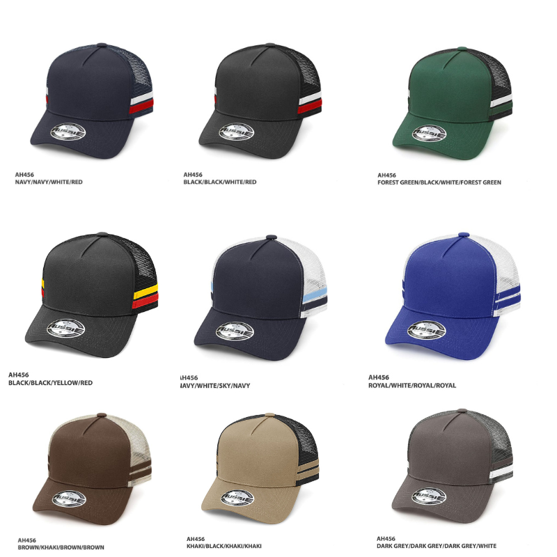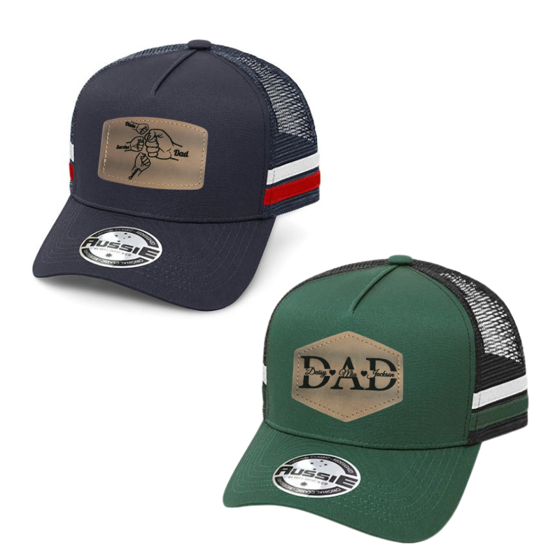 Aussie Stipe Trucker cap paired with genuine cowhide leather patch. Engraved with your personalisation with 5 designs to choose from.